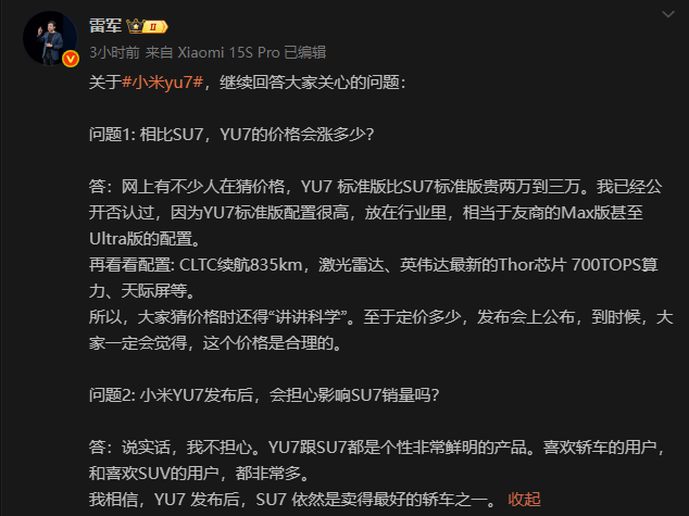 YU7 has a CLTC range of 835 kilometers, and is equipped with high-end configurations such as lidar, Nvidia's latest Thor chip (700TOPS computing power), skyscraper screen, etc. Therefore, pricing should be scientifically considered from its configuration perspective. Regarding the final selling price, Lei Jun said that it will be officially announced at the press conference, and everyone will find that the price is reasonable.