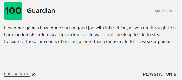 "Assassin's Creed: Shadow" injects new vitality into the stagnant series. Although it is long, it is always fascinating and has no boredom. It perfectly blends fiction with historical facts, is full of respect for Japanese culture, and is an extremely successful work.