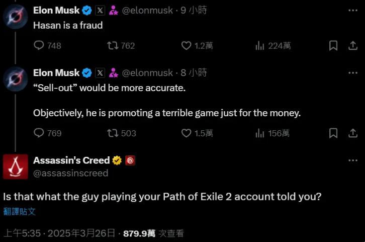 Tesla CEO Elon Musk posted a post at the release of Assassin's Creed: Shadow in May last year: "DEI kills art." Recently, he bombarded the well-known game anchor Hasan on social media to promote the game's behavior of "promoting bad games to make money." Unexpectedly, Ubisoft directly used his official account to retaliate and found out the old account of Musk's "Road to Exile 2".