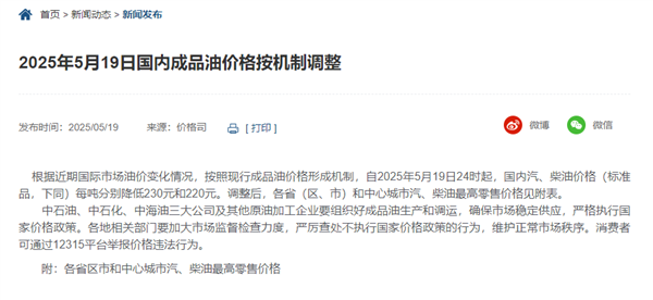 According to the website of the National Development and Reform Commission, the new round of refined oil price adjustment window will open at 24:00 today, and the domestic retail price limit of automobile and diesel will be reduced by 230 yuan and 220 yuan per ton respectively.