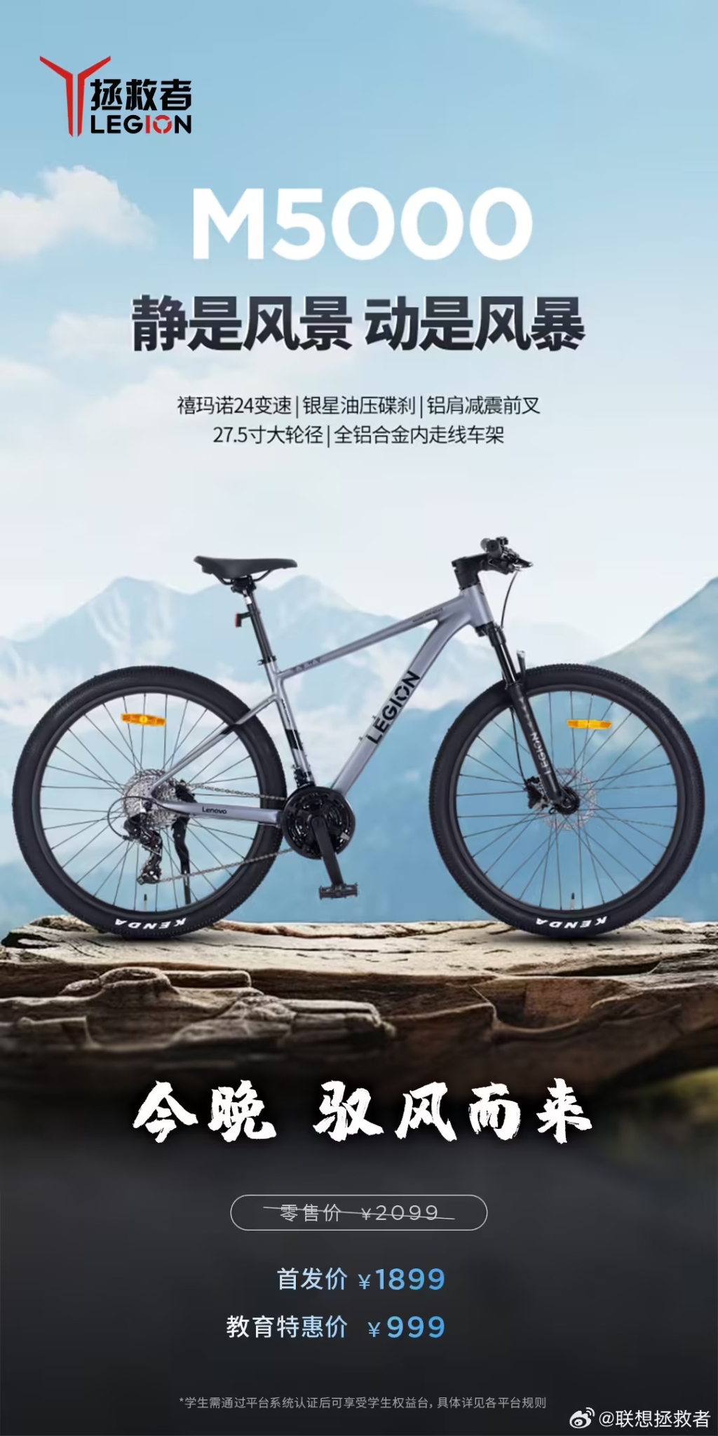 Lenovo Saves Mountain Bike M5000 will be released at 19:00 tonight, with a suggested retail price of 2099 yuan, an initial price of 1899 yuan, and a 999 yuan after superimposing educational discounts.