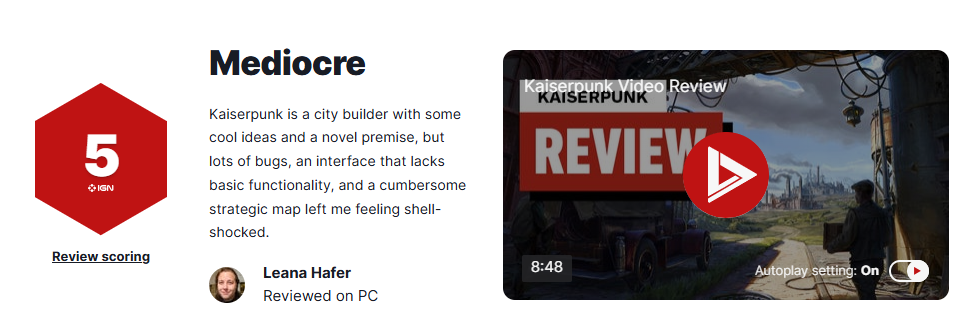Recently, the city construction strategy game "Kaiserpunk" was officially released. IGN reviewed it and scored 5 points (mediocre).