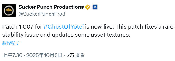 Short ago, Sucker Punch Productions has launched a version 1.007 patch for "Soul of Sheep Hoof Mountain", which mainly fixes a rare stability issue and updates some resource textures. Stability issues and update some resource textures. This update is just days after the game is released, and it is more like a hot fix designed to quickly resolve legacy issues that are not covered by the first-day patch.