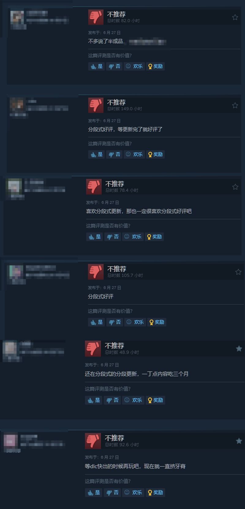 Players generally expressed dissatisfaction with the content volume of this update, and criticized Capcom for being "squeezing toothpaste". A player sarcastically said in the comment section: "Since you like to update in segments, then give bad reviews to segments, right?"