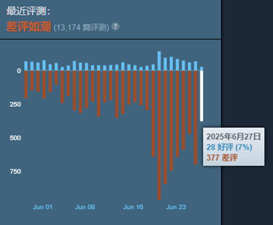 However, despite the update bringing new monsters and challenges, the player's response is still poor. According to Steam platform data, the game's positive review rate in the past month was only 14%. After the update announcement was released, 377 new negative reviews were added in a single day, and the positive review rate on the day fell to 7%.