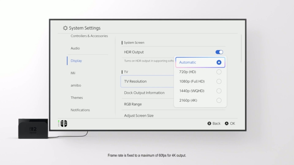 After Switch 2 is inserted into its new dock, the game can be 4K (3840 x 2160) resolution, 60fps frame rate, or 1080p/1440p (1920x1080/2560x1440) resolution, 120fps frame rate.