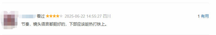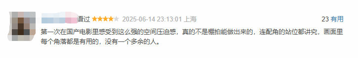 Some viewers praised the audio-visual language and narrative details of the film. Some people commented: "The first time I felt such a strong sense of space oppression in a domestic movie, it is really not something that can be done in studio shooting. Even the supporting roles are in particular. Every corner of the picture is useful, and there is no redundant person." "The rhythm and lens language are all good. The lower part should be hit while the iron is hot."