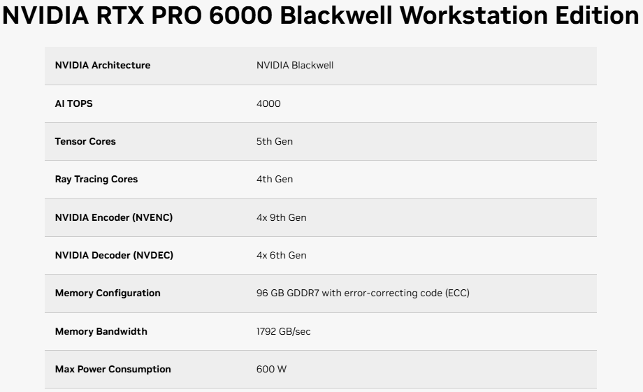 Finally, NVIDIA also launched the RTX PRO 6000 Blackwell Max-Q version with a single blower design. Although the number of CUDA cores and memory capacity remained unchanged, the overall power consumption was directly reduced to 300W, at the cost of declining computing performance, ray tracing performance dropped from 380 TFLOPS to 333 TFLOPS, and AI computing power dropped from 4000 TOPS to 3511 TOPS.