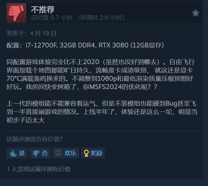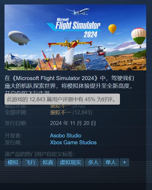 At present, "Microsoft Flight Simulation 2024" has a "mixed review" on Steam, with a total of 12,842 reviews, with a positive review rate of only 45%. The main issues reported by players focus on poor optimization performance and controversy in paid content.