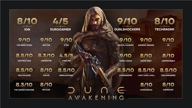 What captures the media is not just a real immersion world. IGN gave Dune: Awakening 8/10; Eurogamer gave 4/5 and praised its "excellent survival gameplay"; Screenrant said "indulged to forget to eat"; Dual Shockers gave 9/10 and commented "I believe Dune: Awakening will become the work that we will call "one of the best games in history" when we review ten years later."