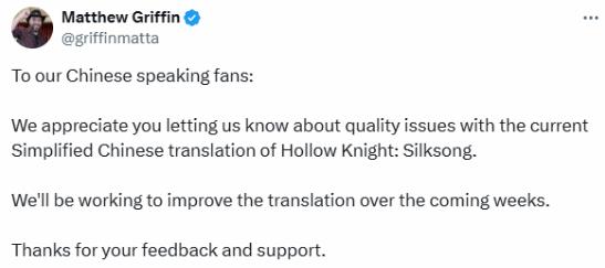 In response to this situation, Matthew Griffin, head of distribution and marketing at developer Team Cherry, said through social media that the team has noticed the feedback from player results caused by translation quality and plans to focus on optimizing localized content in the next few weeks. The industry speculates that with the correction and improvement of the Chinese translation, the reputation of the game in the Chinese-speaking area is expected to rebound significantly, which is worthy of continued attention from players.