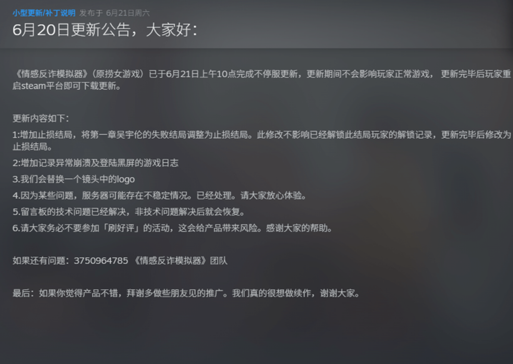 "Lucky Girl Game (lnyx)" has been controversial since its release, and has even been renamed "Emotional Anti-Fraud Simulator". After the name change, the game introduction on the Steam store page was also updated, emphasizing that the renamed version is exactly the same as the first version and has not been deleted.