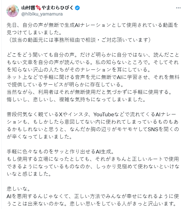 Before the video was removed, there were doubts and pointed out that its Japanese AI commentary was suspected of using his voice data for training without the consent of well-known voice actor and singer Hibiku Yamamura. On September 6, Yamabianxiang posted on the X platform that it found that its voice was used for AI commentary without authorization. Although it was not directly named, the content clearly pointed to Korami Video. She said she felt "sad, powerless and frustrated" about this and said she had entrusted the firm to handle the follow-up matters.