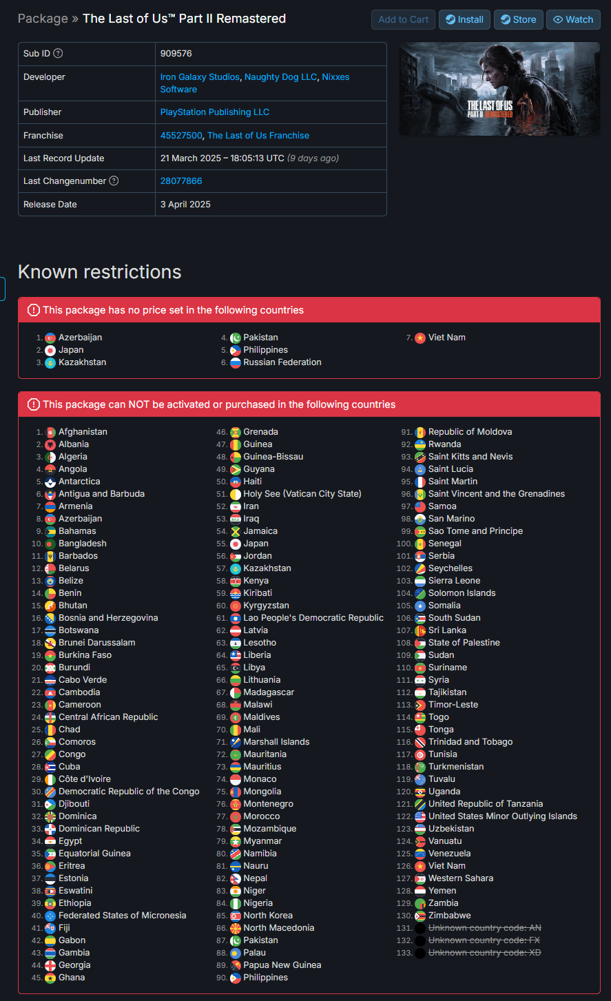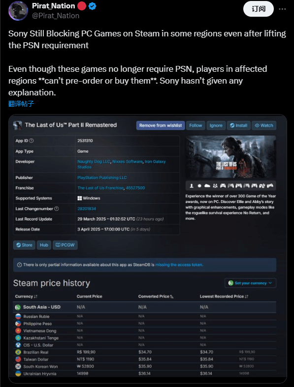 Sony's PlayStation exclusive games have been launched on the PC platform one after another. The PC version of "The Last of Us 2 Remake" will be released on April 4, but SteamDB data shows that the game cannot be purchased in more than 100 countries.