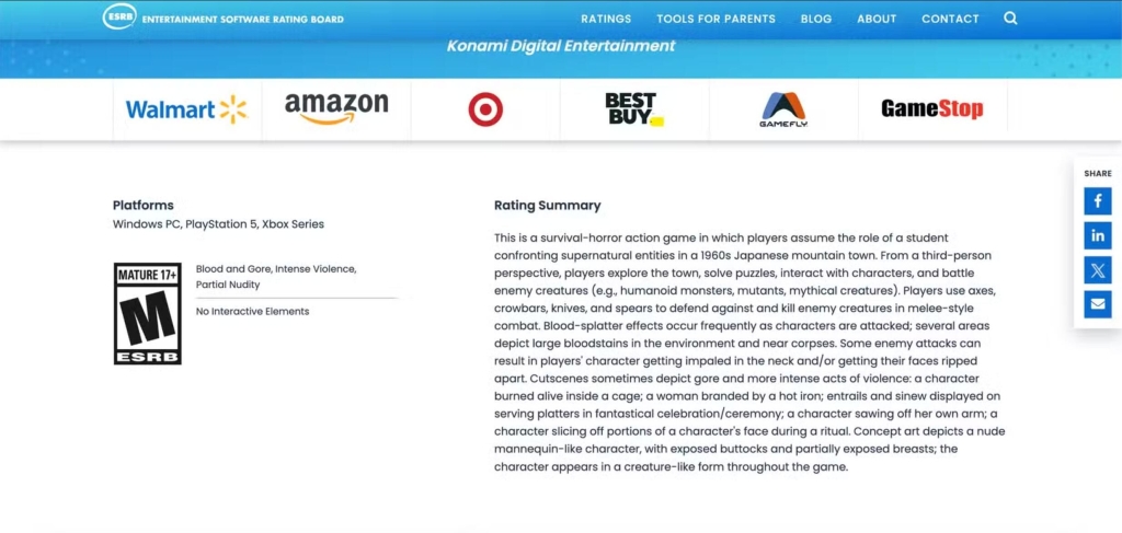 In addition, "Silent Hill F" has a rating of "M" (adult level) on ESRB, which is suitable for players aged 17 and above. The rating tag includes bloody residual limbs, fierce violence, and partial nudity.