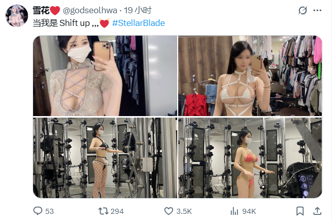 Recently, Yin Xuehua, a costume model in "Stellar Blade", posted several work photos of Shift Up on social media. He appeared in the studio wearing multiple sexy outfits, which caused heated discussion among players.