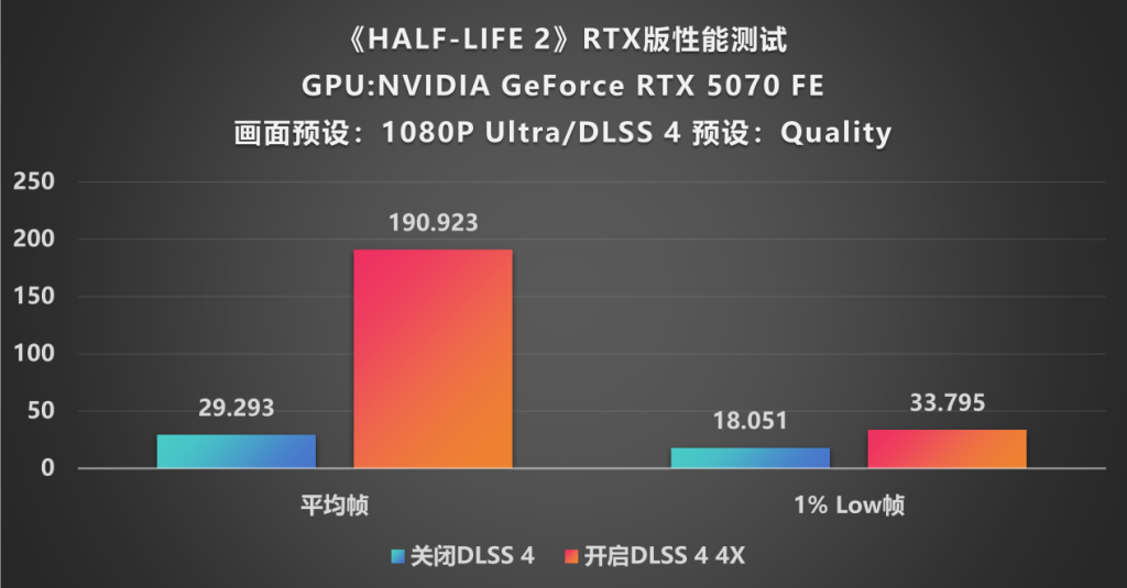 In the RTX version of "Half-Life 2", we first conducted performance tests on the GeForce RTX 5070 FE. Since the landscape and buildings in the game fully adopt real-time ray tracing technology, this greatly improves the performance requirements of graphics cards. We tested the GeForce RTX 5070 FE at 1080P resolution. Without DLSS 4 turned on, the average frame count is only 29 frames, which makes the performance a bit difficult. However, after turning on the highest image quality preset and enabling the 4X quality mode of DLSS 4, the average frame count jumped to 190 frames, with a huge increase in frame count and amazing performance. In addition, thanks to the support of NVIDIA Reflex technology, the system delay is significantly reduced and the response speed is faster, providing players with a more accurate operating experience at critical moments, further improving the smoothness and immersion of the game.