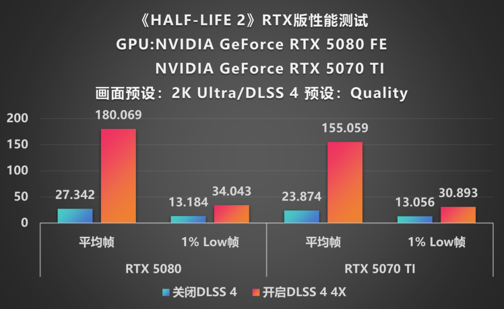 At the same time, we compared the performance of NVIDIA GeForce RTX 5080 FE and RTX 5070 TI under 2K Ultra image quality, and enabled the quality mode of DLSS 4 4X. After turning on DLSS 4, the performance improvements of the two graphics cards are also very exaggerated, especially in terms of average frame count. When the RTX 5080 FE turned on DLSS 4, the average frame rate reached 180 frames, and the amplitude of the RTX 5070 TI also performed well, with the average frame rate reaching 155 frames. The 1%low increase greatly reduces the player's frame drop and lag in complex environments, making the player's gaming experience more smooth. Overall, the activation of DLSS 4 further optimizes the gaming performance, which is very powerful.