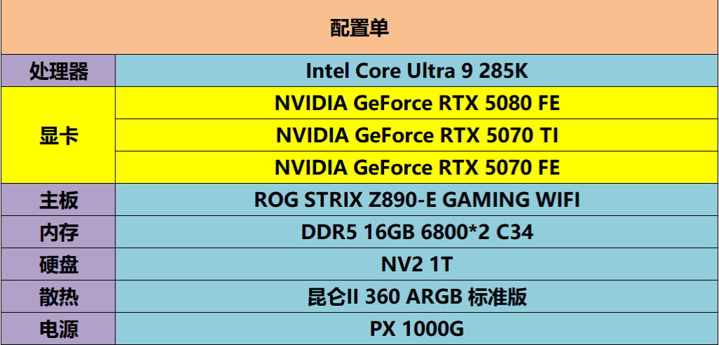 In terms of configuration, in order to ensure the accuracy of the test results and avoid the impact of the barrel effect, we chose Intel's latest flagship processor, Ultra 9 285K, and paired with Asus' ROG STRIXZ890-E flagship motherboard. In addition, we also used three graphics cards to build a test platform to eliminate possible hardware bottlenecks during the testing process. The specific configuration list is shown in the figure.