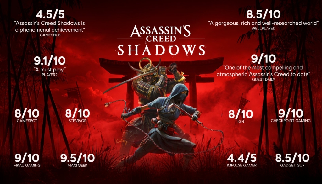 In the picture, the media's ratings are between 8-9 points, of which IGN and GameSpot both gave 8 positive reviews, while media such as Quest Dally, Mkau GAMING, Player2 gave high scores of 9 points for this game. AMESHUB said: "Assassin's Creed: Shadow is an extraordinary achievement", and WELLPLAYED praised: "This work is a gorgeous, rich and deeply studied world."