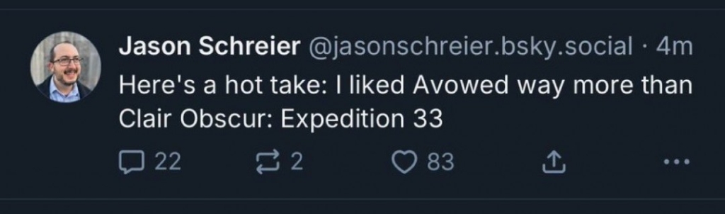 Bloomberg Game reporter Jason Schreier recently tweeted, admitting that he personally likes "Swearing", which is far better than this year's well-received game "Light and Shadow: Expedition No. 33". This has caused considerable controversy on social media, and many people criticized him.