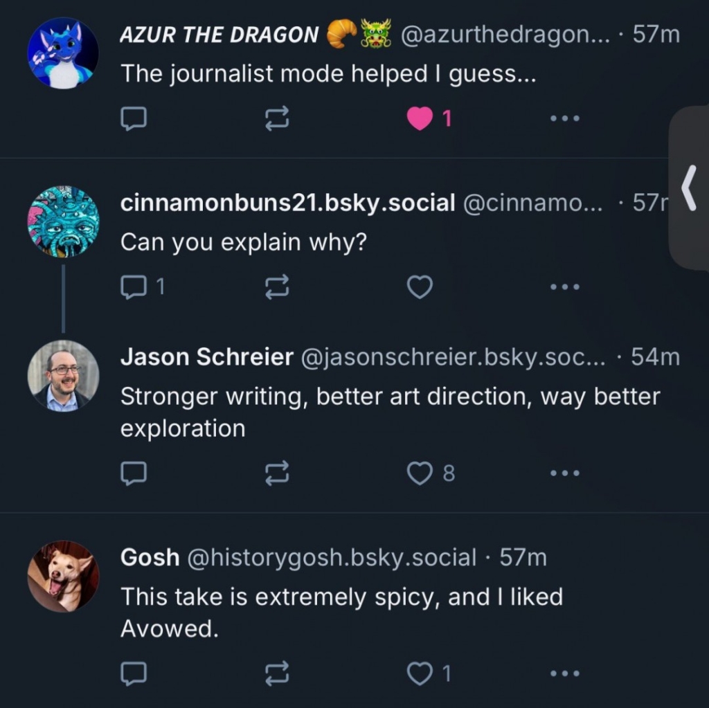 Subsequently, Schreier explained that "The Oath" has a "more powerful plot", a "better artistic direction" and a "more exploration", but one player immediately corrected: "After playing these two games, his view was outrageously wrong."