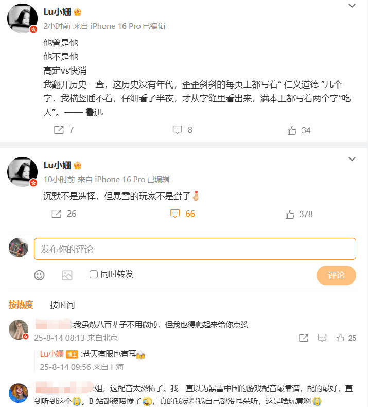At this public opinion storm is getting worse, some sharp-eyed netizens discovered that former Blizzard dubbing director Lu Xiaoshan posted two blog posts on Weibo, and the content seems to be implying the dubbing incident.