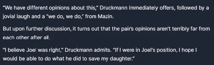 Producer Neil clearly supports Joel's decision, believing that his behavior originated from his father's instinctive desire to protect: "We have different views on this, and I think Joel is doing it right. If I were Joel, I hope I can do everything I can to save my daughter like him." He emphasized that this choice cannot be simply judged by right or wrong.