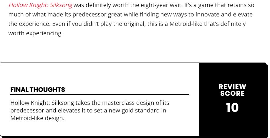 "The Hollow Knight: Song of Silk" brings a carefully crafted Galaxy-like Castlevania experience, which further improves the successful formula of the previous work through higher speed battles, expressive narratives and cruel and worthwhile explorations - although some of the side contents slightly dragged down the pace of the game, the overall experience of the game is still excellent.