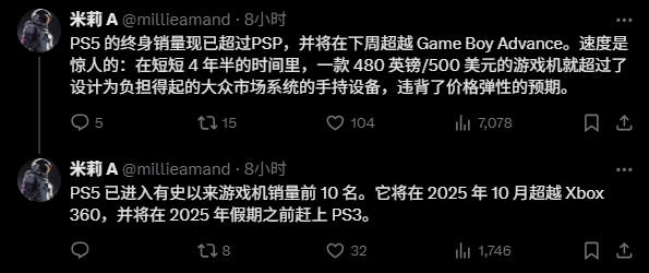 Millie A also revealed that PS5 has successfully entered the top 10 console sales in history, and is expected to surpass Xbox 360 in October and surpass PS3 sales before Christmas.
