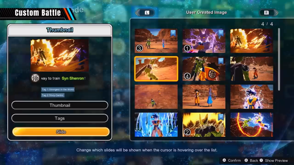 On the other hand, the "Custom Battle" mode allows players to create brand new battles, including level selection, weather effects, and even custom dialogues. These players’ homemade battles can then be shared with other players around the world. In the "Custom Battle" mode example shown, we see many "brained" matchups of Dragon Ball characters.