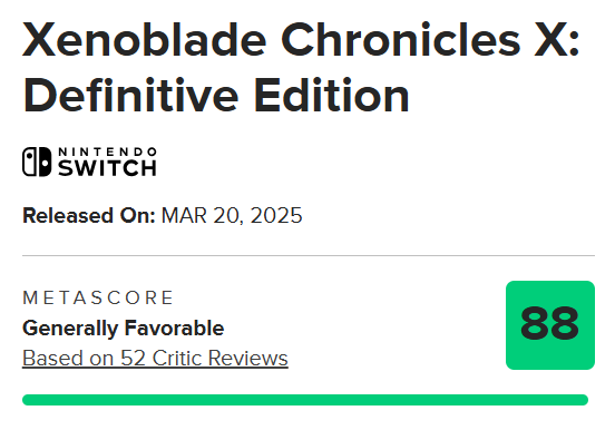 Recently, the media scores of "Xenoblade X: Definitive Edition" were officially lifted, and the media on M station scored 88 points. As of press time, M Station has collected 52 media reviews, all of which are positive.