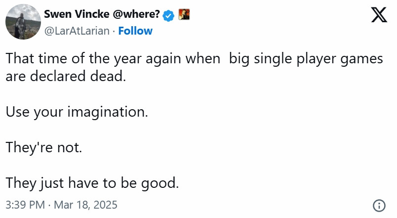 "Bad Gate 3" Director Refutes the Death of Single-player: Single-player games need to be excellent enough