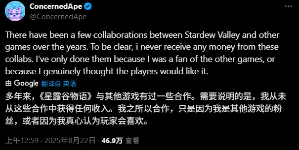 He made it clear that he had never charged any fees for the linkage between "Star Dew Valley" and other games. The reason he chose to cooperate was simply because he was a fan of these games, or he really thought players would like such linkage.