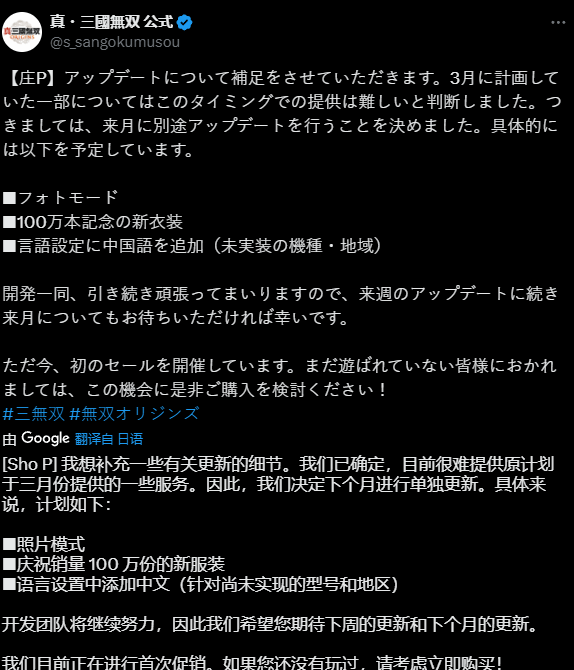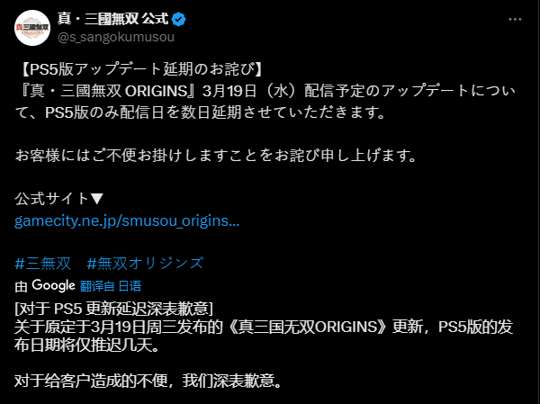 Advanced, "Dynasty Warriors: Origins" was originally scheduled to be released on March 19, adding new content such as Arabic support and balance adjustments. However, the update to the PS5 version will be delayed by a few days. The official announcement announced that the update of the PS5 version, which was originally scheduled to be launched on March 19, will be postponed.