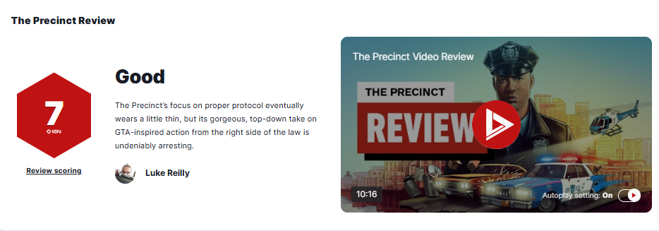 IGN brief review: Although "Police District"'s stylized design of law enforcement is boring, its gorgeous overlooking interpretation of "Grand Theft Auto"-style action game from the perspective of law enforcement is undoubtedly eye-catching.