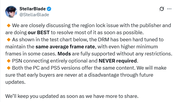 In the same statement, SHIFT UP responded to players' concerns that D encryption may affect performance. According to internal tests, the implementation of DRM has been optimized to ensure the same average frame rate, and some tests even show an improvement in the minimum frame rate. At the same time, mod support will be "completely unrestricted", indicating that PC players can freely adjust or enhance the gaming experience.