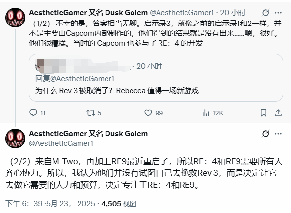 然後,黃昏的戈萊勒姆(Dusk Golem)補充說:“作為《生化危機4:翻拍和生化危機9》需要大量資源,Capcom決定將更多的精力和預算投入到這些項目上,而不會繼續拯救啟示錄3。可以說,他們將資源集中在更關鍵的地方。”