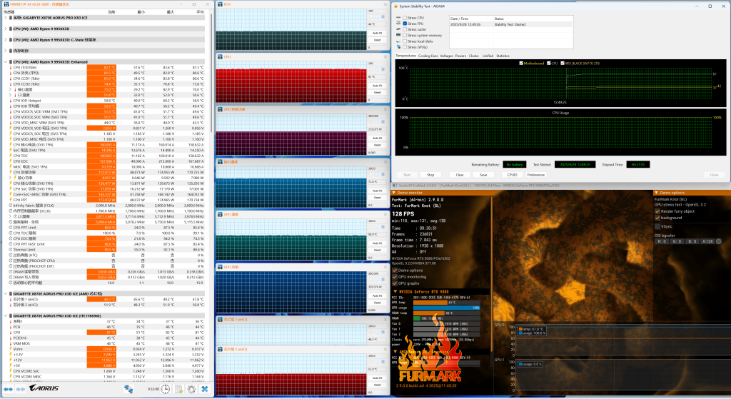 第一個是雙烘烤測試。圖形卡和CPU的最終性能通過連續按下AIDA64和Furmark的兩個系統反複測試。在連續且不間斷的性能發布中測試了主機和系統穩定性的冷卻性能。隨著板的功耗不斷增加,經過30分鐘的烘焙機實驗,我們的Gigabyte E-Sports控制台通過本測試完美地執行。即使CPU的170W和330W圖形卡的可怕功耗,主板的PCH溫度也只有46℃,證明了Gigabyte X870E Aorus Pro X3D ICE E-Sports Ice E-Sports冰雕塑和Gigforce Geforce Geforce Rtx 5080 Master Ice Graphics的組合非常出色,並且非常出色。當然,對於這一點,對於Ryzen 9 9950x3D處理器,90℃的溫度壁確實是一塊蛋糕,頻率降低,滯後和崩潰甚至更不可能。這表明這種X870E AORUS Pro X3D冰e-Sports冰雕塑的溫度確實值得其實心散熱材料。