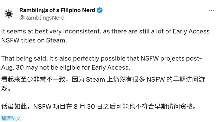 應當指出的是,該政策目前僅適用於8月30日之後新提交的成人內容遊戲。在蒸汽平台上仍然有許多類似的遊戲在“早期體驗”階段仍在正常出售並且沒有受到影響。