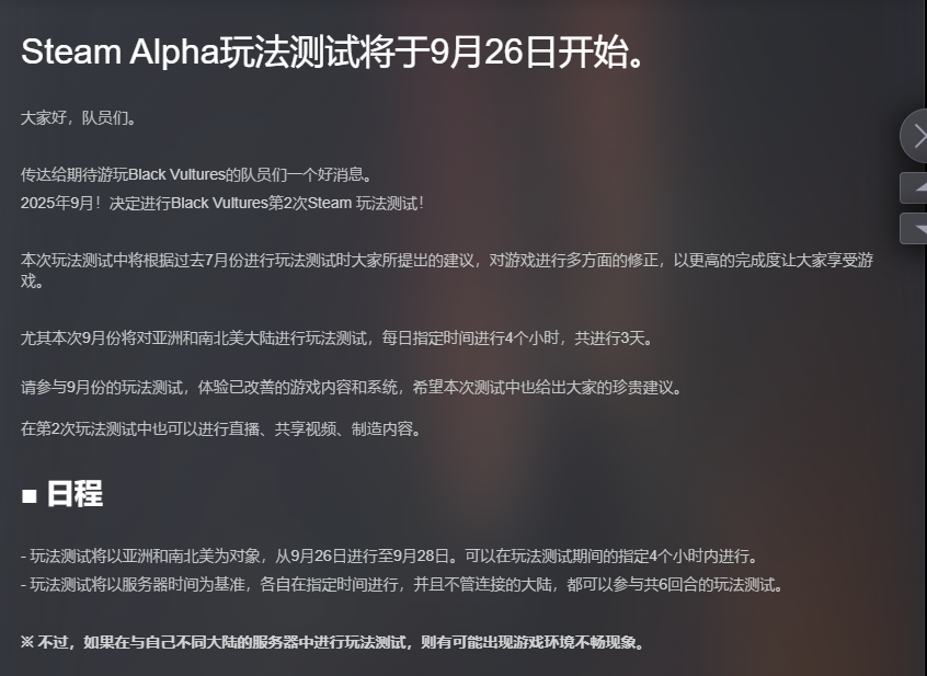 Este teste é para usuários asiáticos e norte/sul -americanos. Vale ressaltar que esta também é a primeira vez que o jogo é aberto a usuários comuns na Coréia do Sul. Os jogadores interessados em participar do teste podem enviar sua inscrição diretamente na página da loja Steam de "Black American Vulture". O testador selecionado receberá um email contendo o guia de participação.