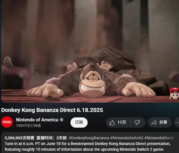 O novo Switch 2 do Console 2 da Nintendo acaba de ser lançado e não há muitas obras -primas oficiais. Recentemente, o trailer do novo jogo "Donkey Kong: Banana" acaba de ser anunciado, subindo em popularidade. O vídeo oficial clicou mais de 3,3 milhões em 2 dias, superando "Mario Kart: World".