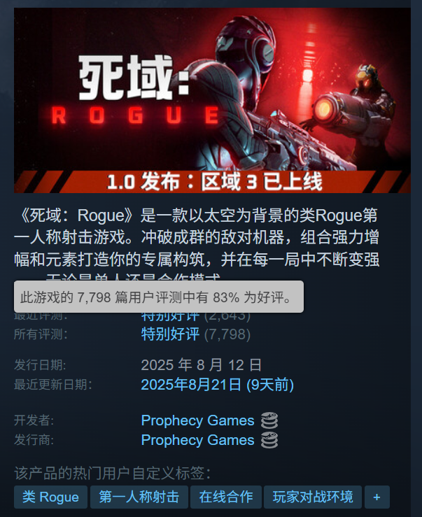 "Dead Domain: Rogue" foi lançado no Steam em 12 de agosto. Antes do prazo, todas as críticas deste trabalho foram "especialmente positivas". Entre as 7.798 análises de usuários, a taxa de elogios chegou a 83%.