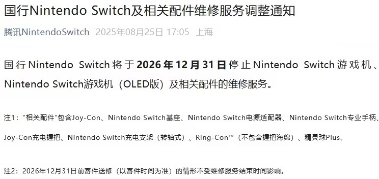 A conta oficial da Tencent Nintendo Switch emitiu hoje um anúncio, anunciando que ajustará as políticas de serviço pós-venda de equipamentos nacionais e acessórios relacionados. De acordo com o "Aviso sobre o ajuste do Nintendo Switch do National Bank e do serviço de reparo de acessórios relacionados", o serviço de reparo de hardware desta versão do host será encerrado oficialmente a partir de 31 de dezembro de 2026.