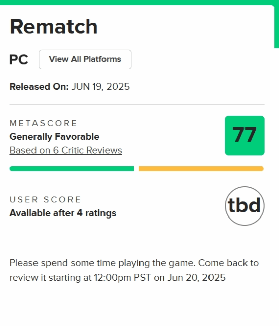 Game8 74 очка: при плавной работе «Relinching»-лучшая футбольная игра в аркадном стиле в настоящее время. Но из -за проблем сети и ошибок, которые нарушают игровой опыт, Sloclap должен решить эти проблемы, прежде чем «стрелять в золотой мяч».