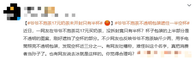 Недавно бренд чайных напитков «Дедушка не производит чай» впал в вихрь общественного мнения из -за воздействия потребителя «17 юаньского молока чая, который не был открыт всего за полча чашки». Согласно видео, выпущенному пользователями сети, половина тела питья «Первая любовь Роуз Цинти», которую он купил, является непрозрачным дизайном. После переворачивания видно, что фактическая мощность составляет менее половины чашки, что вызвало широкие сомнения. Несмотря на то, что бренд извинился и возвращался, лазейки управления франчайзингом и невысказанные правила промышленности, выявленные инцидентом, продолжают бродить.