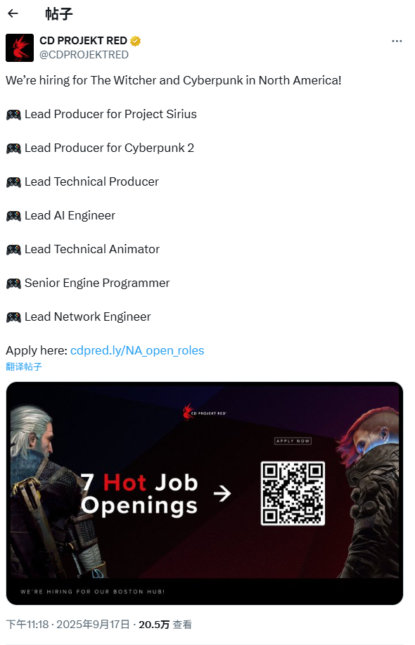 CDPR в настоящее время набирает несколько позиций для проектов Cyberpunk 2 и Wizard Sirius в Северной Америке, в основном включающих главных продюсеров, анимации и технических должностей.