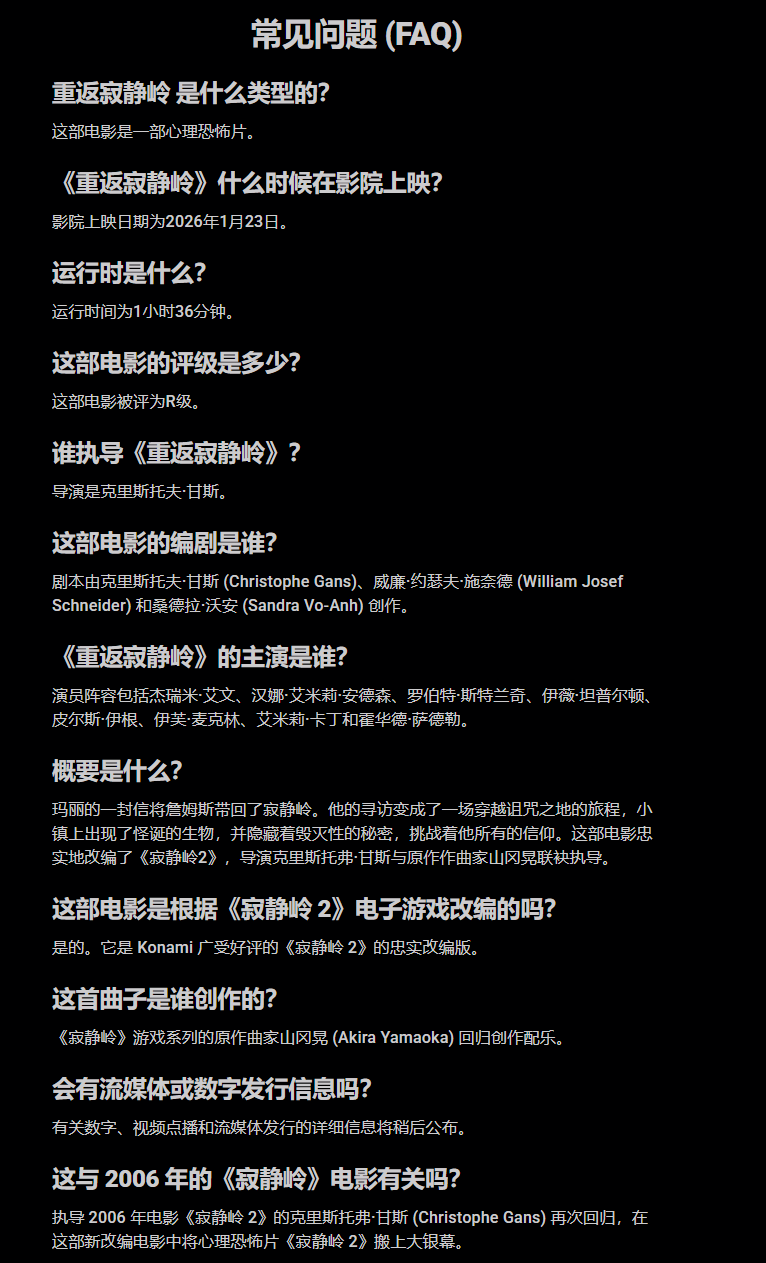 Официальный веб-сайт фильма «Психологический ужас» в прямом эфире «Возвращение к Silent Hill», адаптированное из известной игры «Silent Hill 2», уже официально запущен. Согласно официальному часто задаваемости сайта, этот фильм основан на хорошо принятой игре с одноименной игрой Konami и позиционируется как психологический фильм ужасов R-уровня. Он имеет длину 1 час и 36 минут и, как ожидается, будет выпущен 23 января 2026 года.