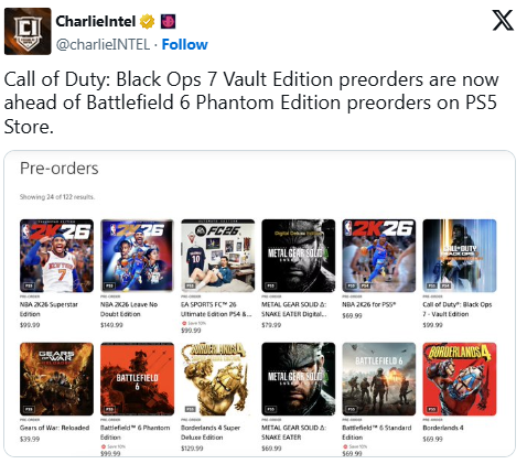 После того, как Battlefield 6 Battlefield 6 Battlefield 6 Battlefield 6 продолжает возглавлять объем предварительного заказа Black Ops 7 (по крайней мере, в магазине PS). Но ситуация поворачивается: согласно данным Charlieintel, Ultimate Edition of Black Ops 7 теперь превзошло стандартное издание и Phantom Edition of Battlefield 6 в списке предварительного заказа. Хотя потребовалось много времени, чтобы наверстать упущенное, в настоящее время опережает стандартные издания «Battlefield 6», «Borderland 4», «Металлическое оборудование Δ: eater Snake» и т. Д., Но он все еще не смог встряхнуть «NBA 2K26», в котором доминировали список с тремя версиями.