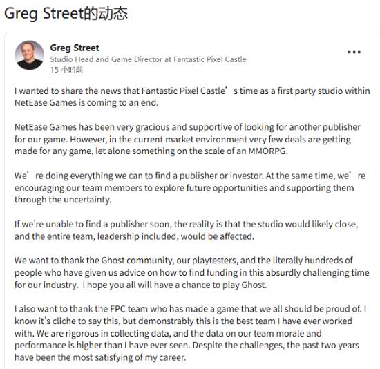 知名设计师鬼蟹(Greg Street)在领英上透露,他们团队开发首款奇幻MMORPG《代号Ghost》面临项目关停危机。而初始投资方是网易,目前已撤资放弃该项目。据本人提到网易曾与工作室曾沟通寻找接盘发行商,但当下市场环境并不看好的MMORPG一眼望到头。